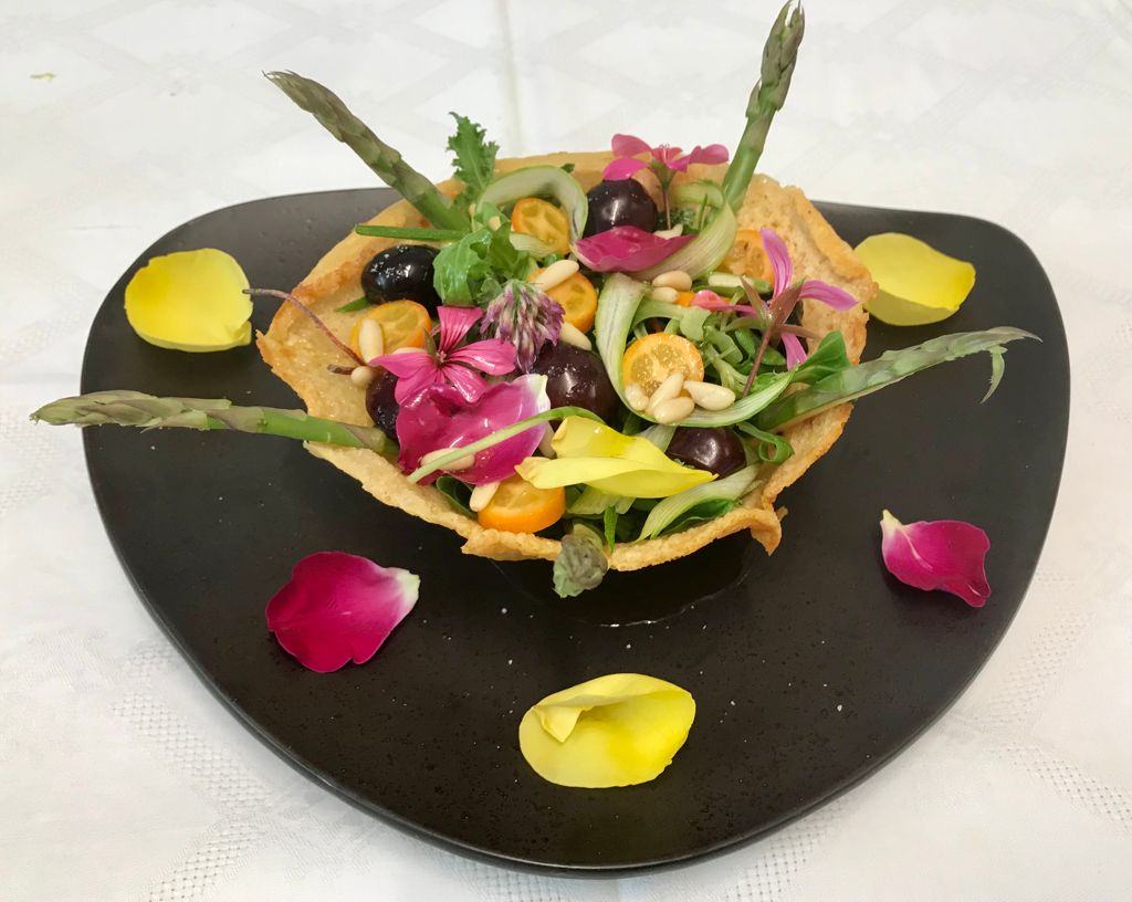 Ti propongo una "Insalata primavera su un cestino di grana padano d.o.p." abbinata ad un olio 100% italiano, fruttato leggero. L'insalata dà spazio alla primavera, dalle verdure, alla frutta, ai fiori, un pot pourri di colori per esaltare la bellezza di questa stagione