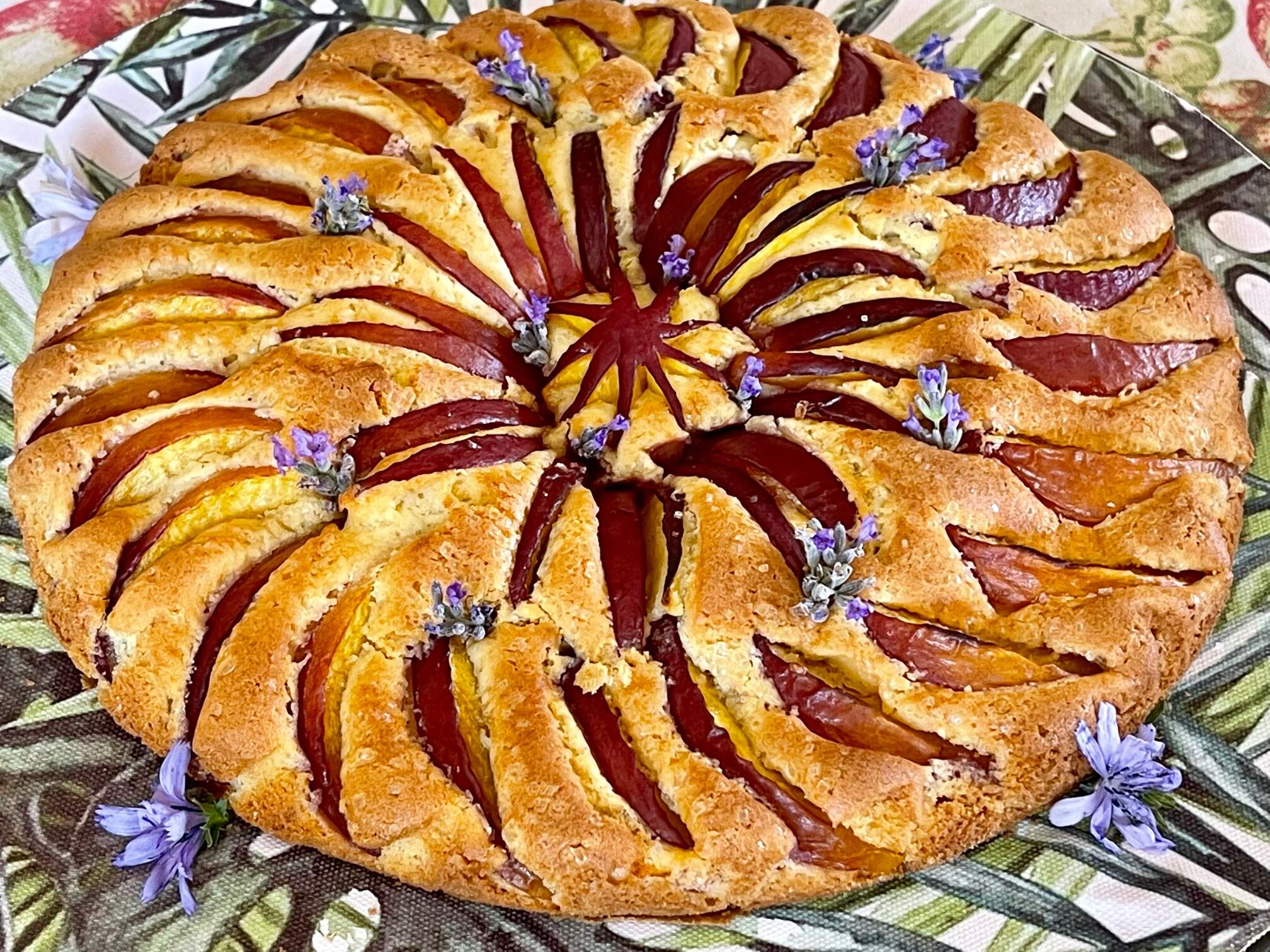 Versare l'impasto in una tortiera a cerniera da 24 cm foderata con carta forno, decorare con le pesche a fette e cospargere sopra un po’ di zucchero di canna.