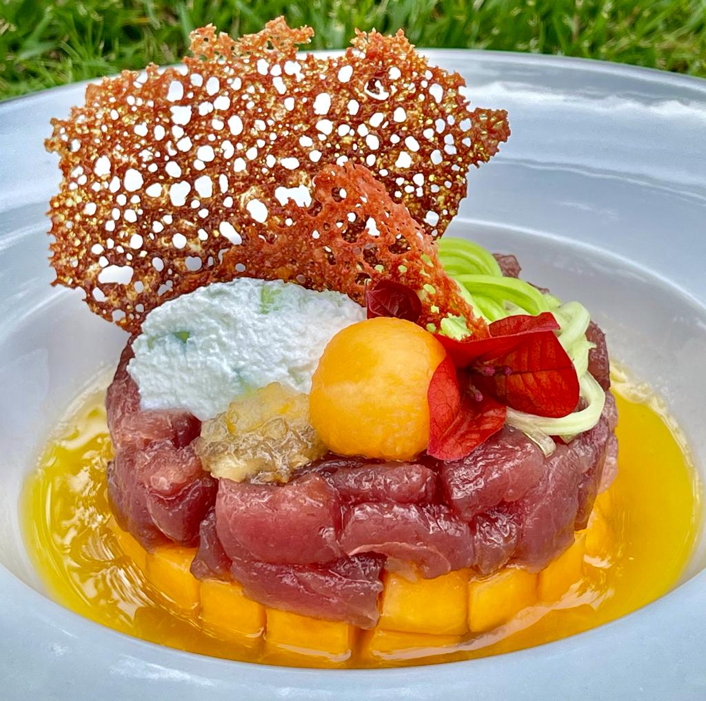 Inserire all’interno di un coppapasta il melone tagliato a cubetti, la tartare di tonno marinata; con due cucchiai bagnati creare una quenelle di ricotta lavorata con un trito di cetriolo.