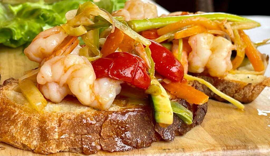 Nel frattempo spadellare il porro, la zucchina, la carota e il peperone precedentemente tagliati a striscioline. Salare e pepare. Farcire la bruschetta con le verdure e adagiare i gamberetti scottati leggermente in padella.