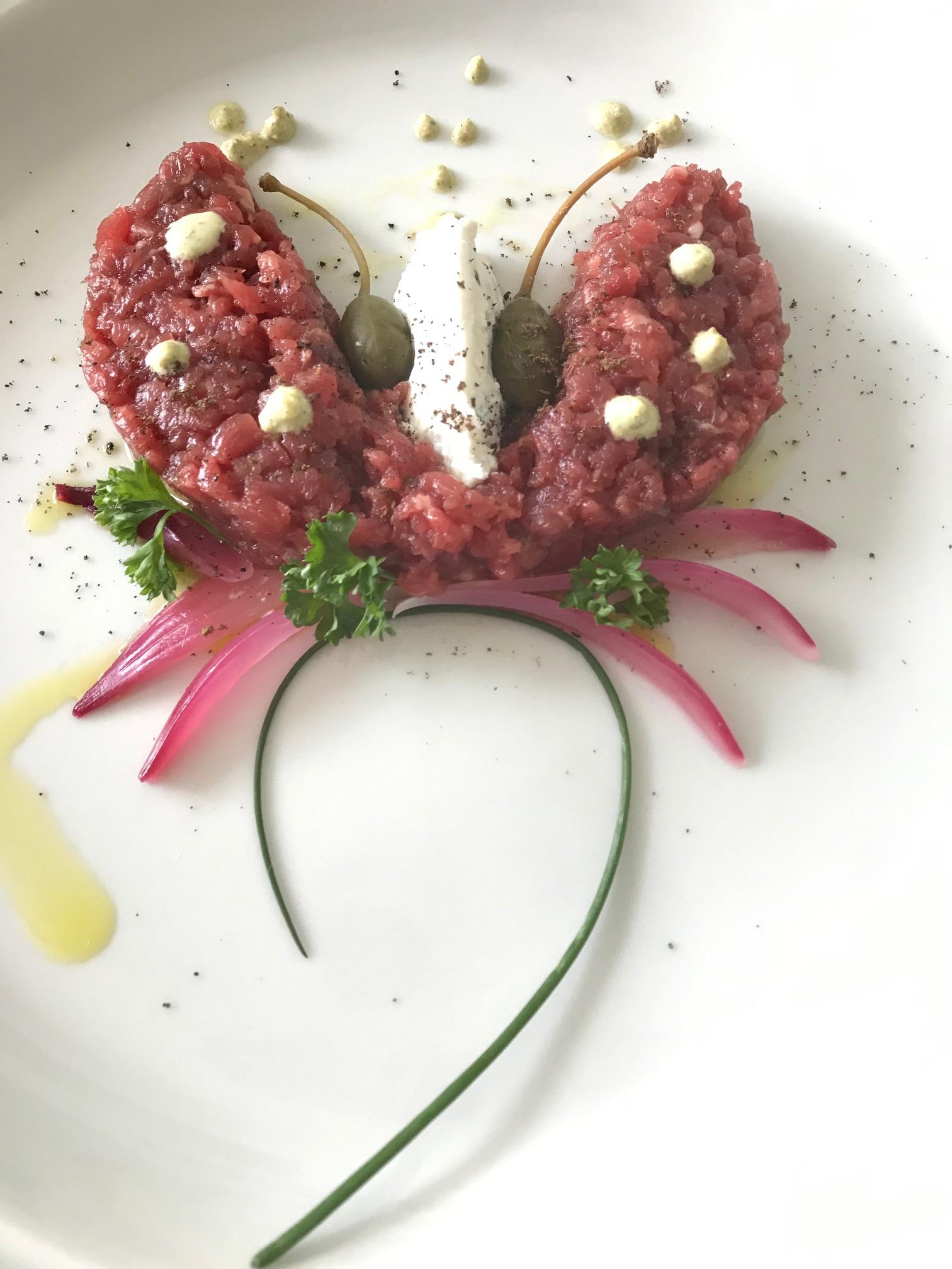 Con l’aiuto di un coppapasta, comporre un disco al centro di un piatto e aprire a metà per dare la forma di fiore sbocciato. Aggiungere qualche punto di crema di pistacchi. La quenelle di caprino fresco farà da “pistillo”, i 2 capperi gli “stami”, la cipolla caramellata costituirà i sepali e il filo di erba cipollina rappresenterà il peduncolo del “fiore di battuta”. Aggiungere qualche ciuffo di prezzemolo riccio, una grattugiata di tartufo nero e un ulteriore filo di olio extra vergine di oliva Tuscia Dop a crudo.