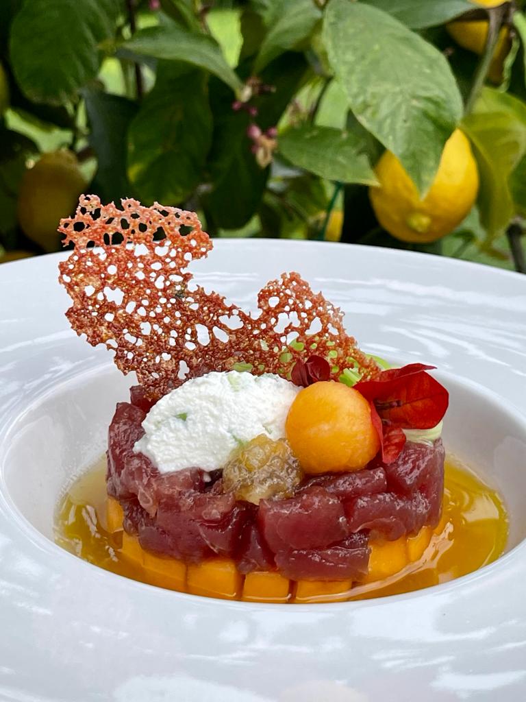 Inserire all’interno di un coppapasta il melone tagliato a cubetti, la tartare di tonno marinata; con due cucchiai bagnati creare una quenelle di ricotta lavorata con un trito di cetriolo.