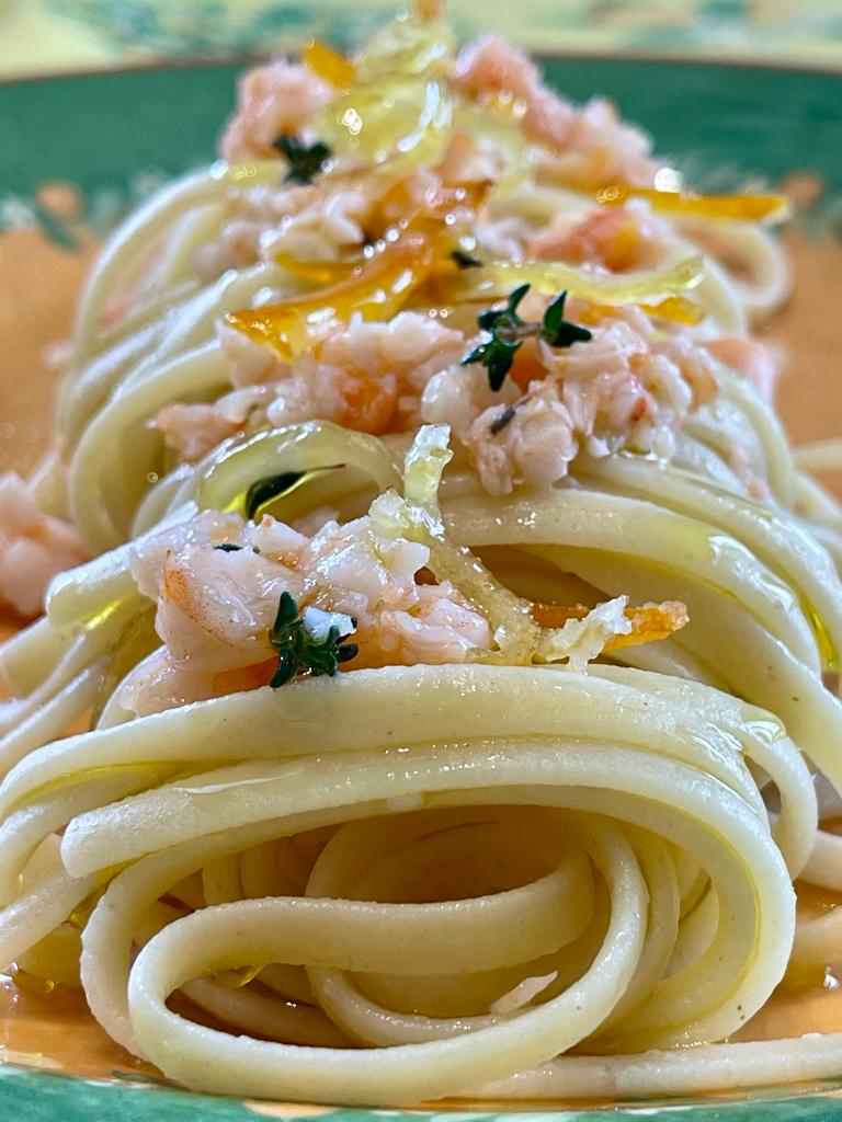 Scolare le linguine precedentemente cotte in abbondante acqua salata, saltare nella padella con i gamberi e unite un filo d'olio extra vergine d’oliva. Servire subito aggiungendo qualche zesta caramellata.