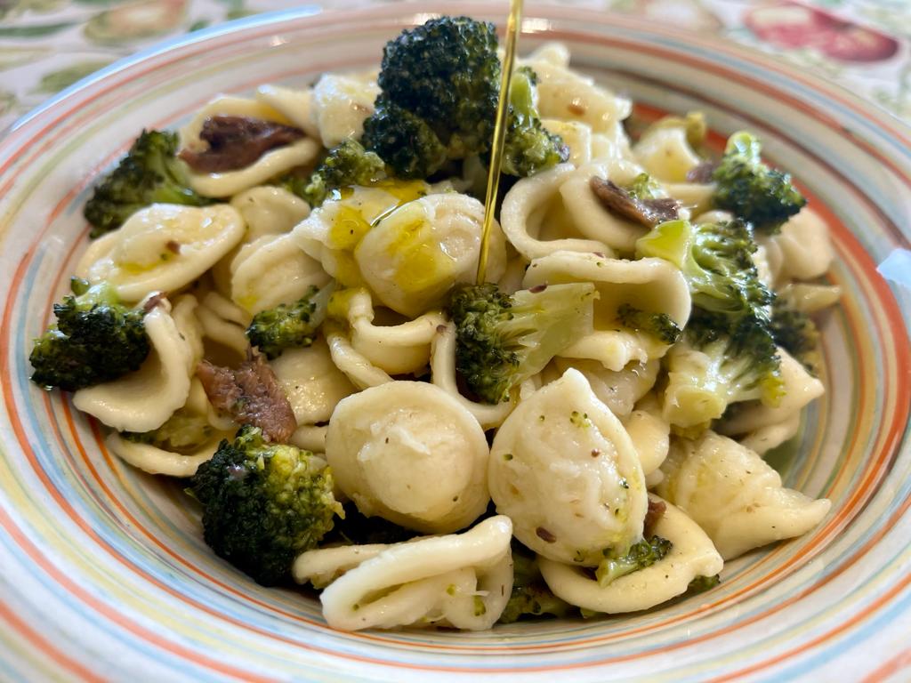 Quando pasta e broccoli sono cotti buttarli nella padella e farli saltare nella “cremina” di acciughe aggiungendo un filino di acqua di cottura se necessario. La pasta non deve risultare troppo asciutta.