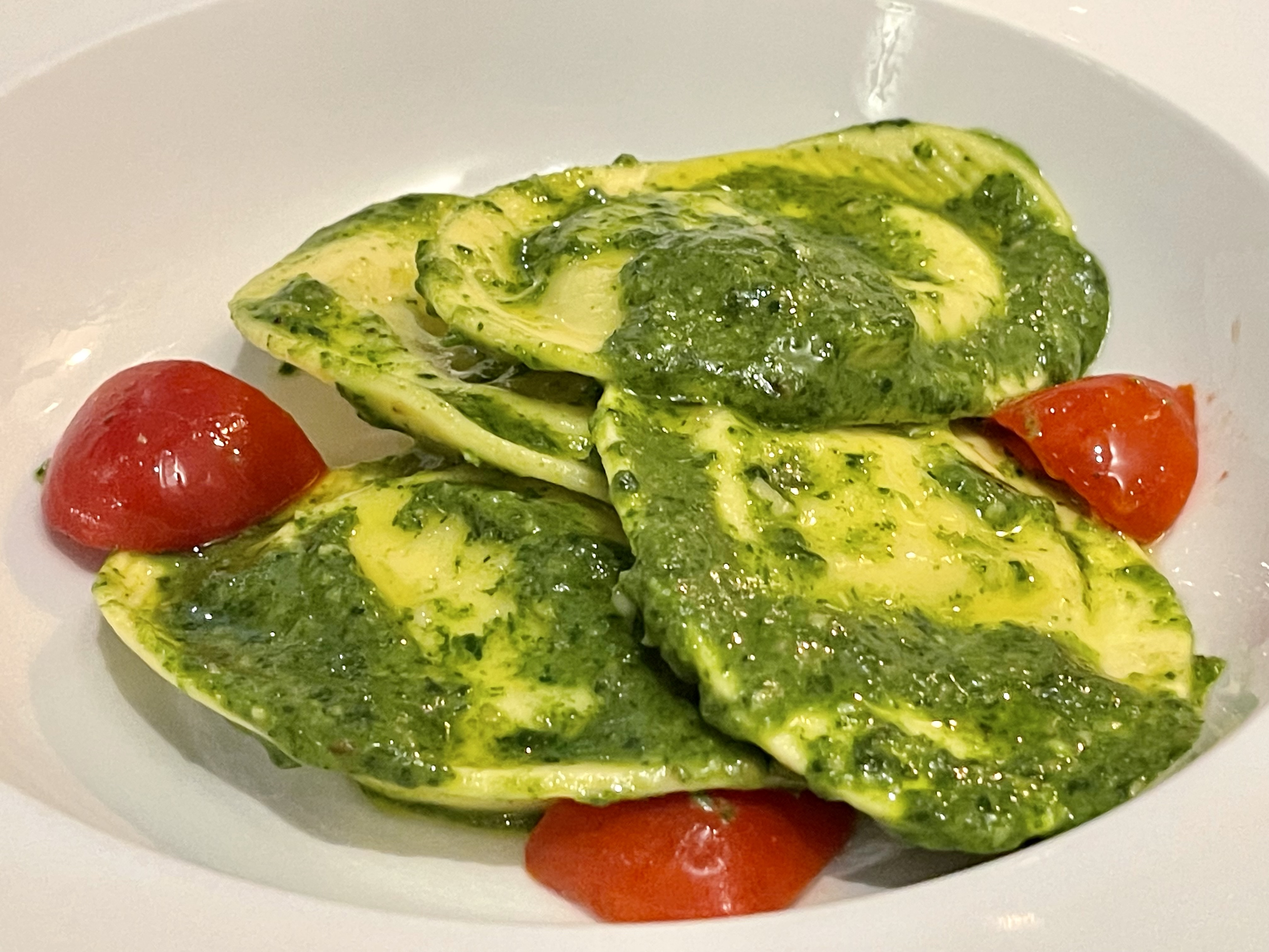 Cuocete i ravioli in acqua bollente salata, scolare, aggiungere il pesto al basilico, mescolare delicatamente e servire aggiungendo qualche pezzo di pomodorino e un filo di olio evo da Taggiasca, Colombaia, Merlina e Razzola a crudo.