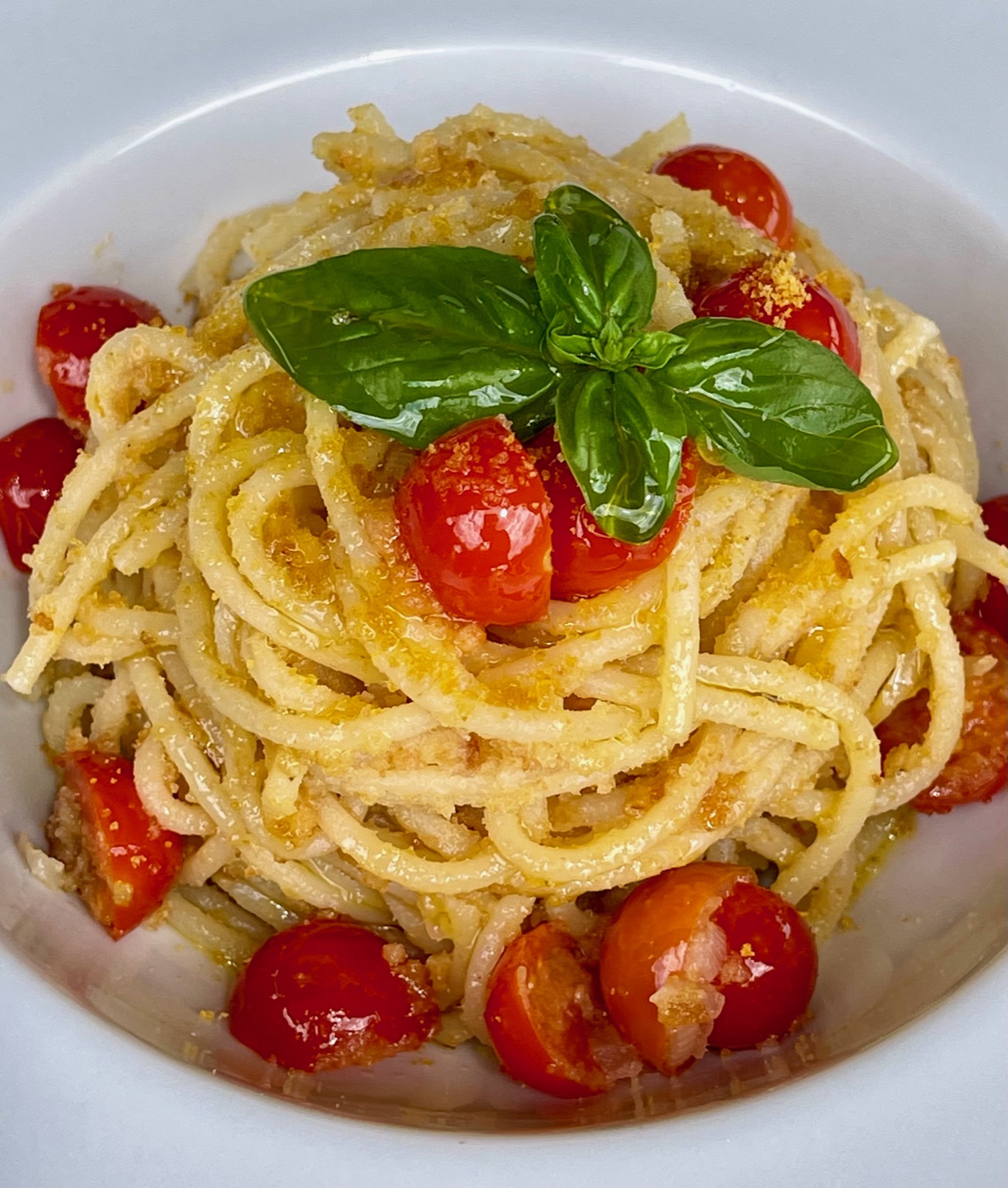 Gli spaghetti vanno scolati al dente per poi ultimare la cottura, a fuoco vivace, nella pentola con i pomodorini, dove andremo ad aggiungere il mestolo d'acqua di cottura della pasta precedentemente prelevata, la panura, la bottarga e del basilico fresco. Mescolare bene e servire subito con un abbondante giro di olio evo monovarietale Nera di Oliena.
