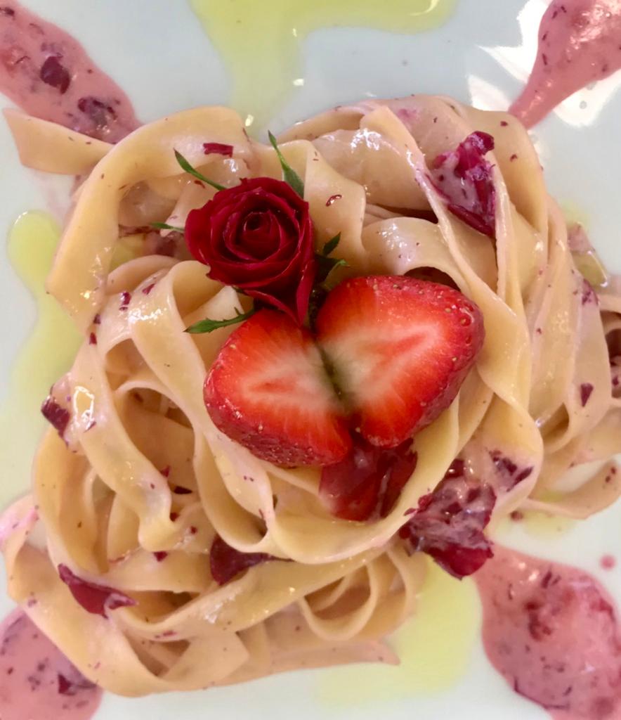Lavare e tagliare le fragole a metà. Mettere i pezzi in un bicchierone assieme alla robiola, ai petali di rosa edibile e un filo di olio evo monovarietale Taggiasca. Frullare il tutto con un frullatore ad immersione fino ad ottenere un sugo cremoso.