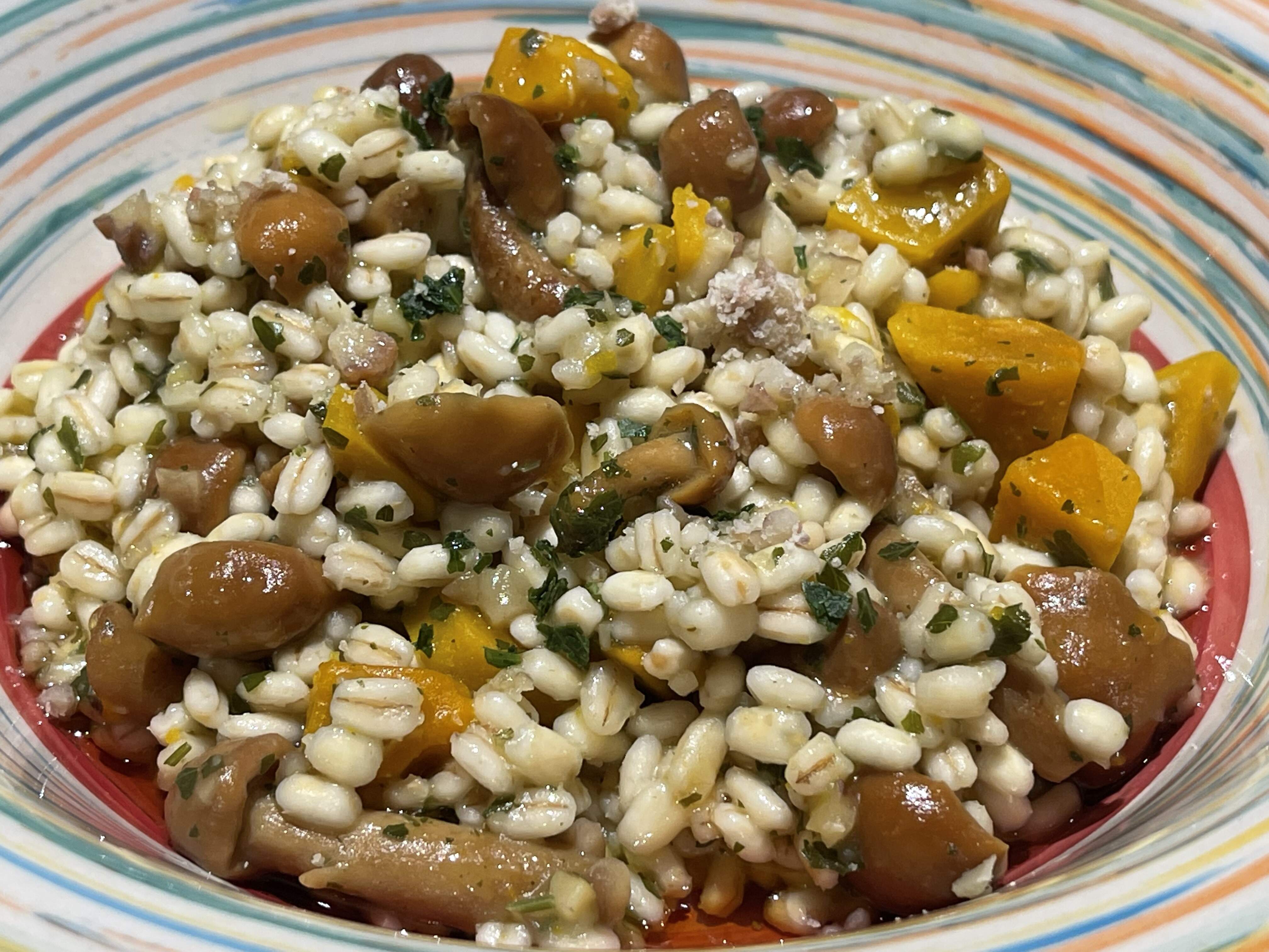 A pochi minuti dal termine della cottura dell’orzo, aggiungere la zucca a cubetti, aggiustare di sale, pepe e aggiungere una manciata di prezzemolo tritato. Infine, mantecare fuori dal fuoco con olio evo italiano da Rossanel, Trep e Fort a crudo.