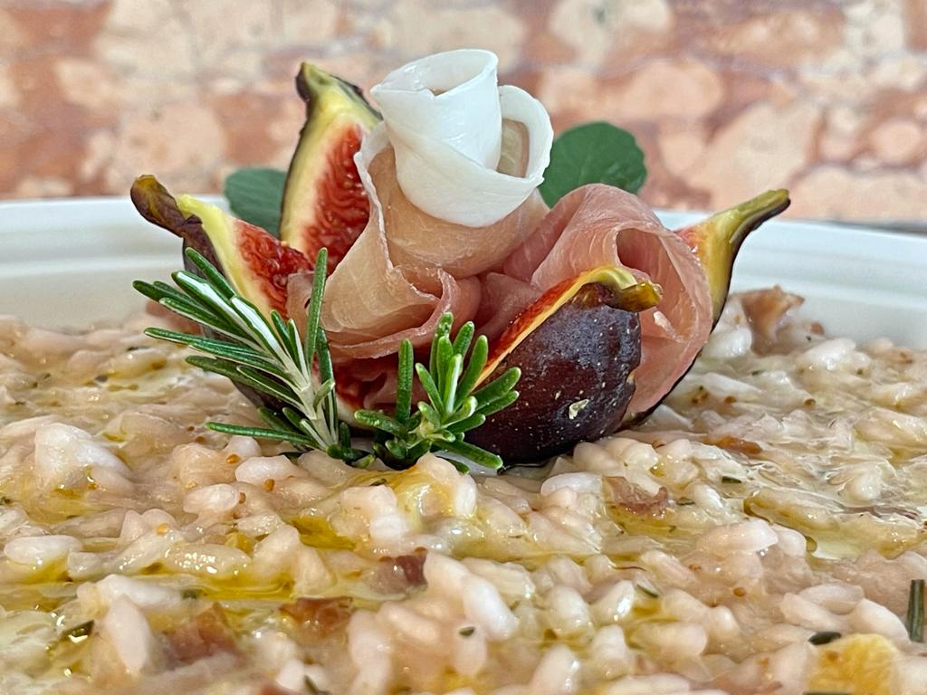 Versare il risotto in un piatto da portata, impreziosire con il fico, le roselline di prosciutto crudo, 2 rametti di rosmarino e un giro di olio evo monovarietale Leccino.