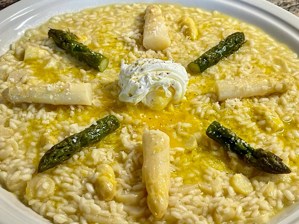 Aggiungere il riso e lasciarlo tostare per bene. Sfumare con il vino bianco. Una volta che il vino sarà completamente evaporato aggiungere il brodo vegetale caldo un po’ per volta, sino a che il riso non è completamente cotto. A metà cottura aggiungere le punte degli asparagi tenute da parte.