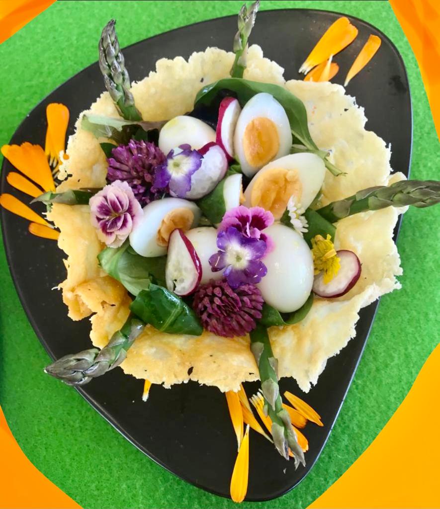 Una volta indurito, il cestino di grana sarà pronto per essere riempito con la misticanza, i rapanelli e gli asparagi verdi precedentemente puliti e tagliati, le uova di quaglia sode e i fiori eduli.